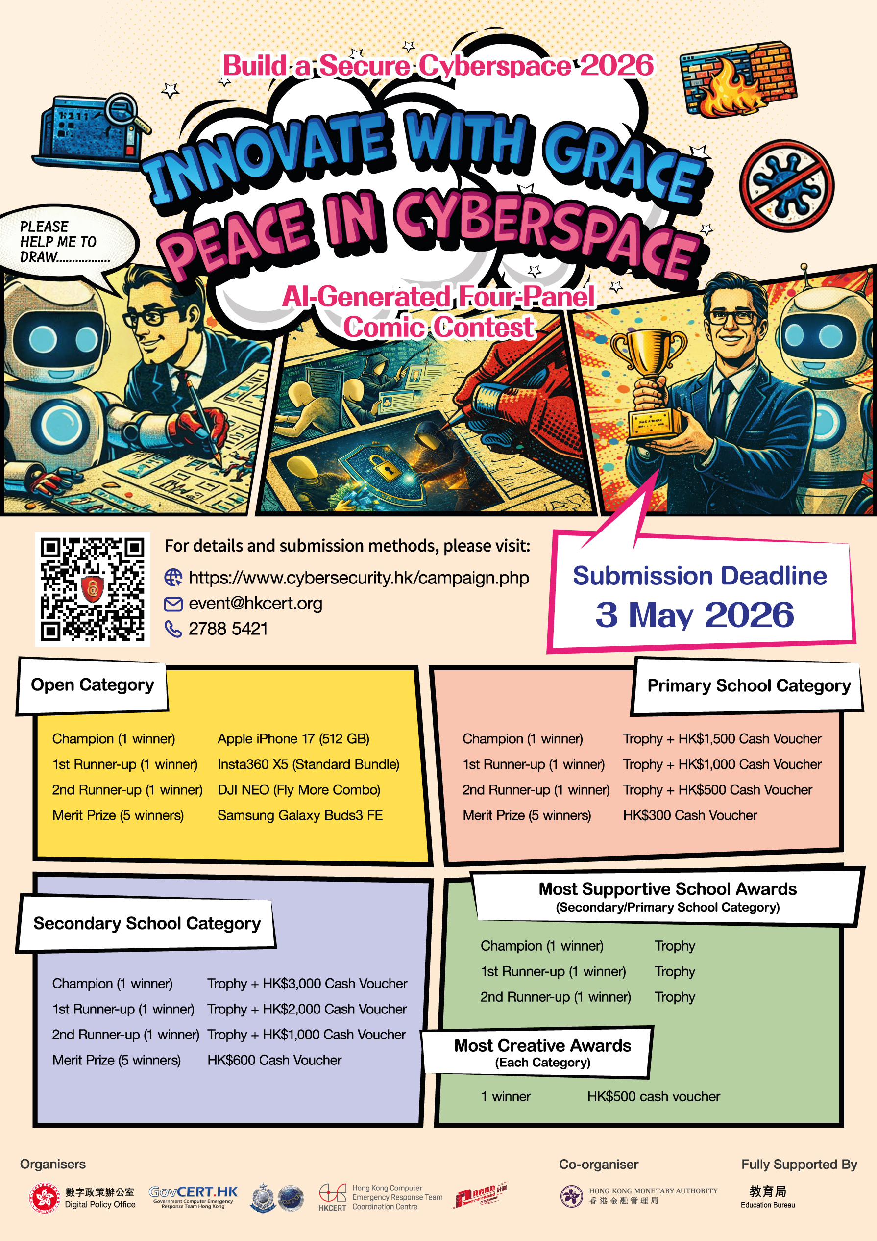 The Digital Policy Office, the Cyber Security and Technology Crime Bureau of the Hong Kong Police Force and the Hong Kong Computer Emergency Response Team Coordination Centre are co-organising the “Innovate with Grace, Peace in Cyberspace” AI-Generated Four-Panel Comic Contest. This Contest aims to inspire creativity by encouraging participants to use artificial intelligence (AI) tools to create simple and easy-to-understand four-panel comics. The goal is to convey important cybersecurity messages, raising public vigilance against cyber threats and promoting preventive measures through an engaging and enjoyable experience. We welcome everyone to take part in this event!