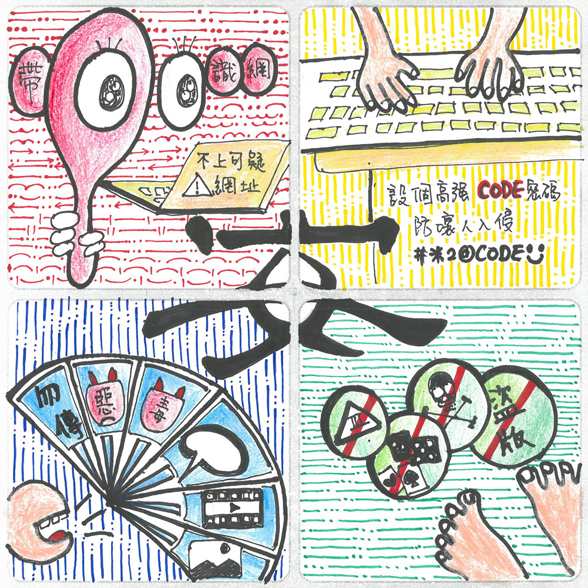 定期消毒、更新密碼、小心有詐、謹慎交友